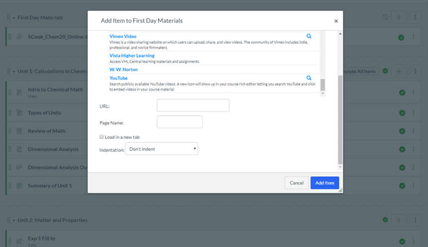 If you go to one of your modules and hit the little + button (add), you’ll be taken to a menu where you can select what you want to add. For direct linking, you have two options. The first option is the ‘External URL’, which is shown in the picture below. Click it, fill in the URL for your video, then name the page. You can also select whether or not clicking the link takes you to another page. Easy.