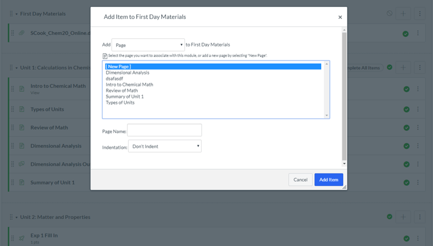 But putting your videos into Pages, you can keep your students on your Canvas site. Additionally, you can add information before or after the video in order to aid their understanding. To do this, simply hit the + button again, but this time, select Page. Highlight the [New Page] option and add a name.
