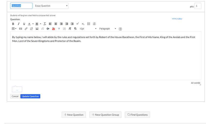 The students can’t get access to the Exam until they do the Honor Code. Neat, huh? So I wouldn’t recommend this as your ONLY means of keeping students from cheating. I recommend randomized questions, timed exams, and some other stuff that I may end up talking about sometime during the worst spring break party ever (SPRING BREAK 2020 BABY! CORONAVIRUS GOOOO!).