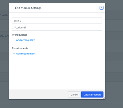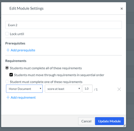 So first, click Add requirement. Under ‘Student must complete one of these requirements’ first select your Honor Code survey, select ‘score at least’ and put the max points. I don’t know if its needed or not, but its a nice little touch and plays it safe. The important part is under ‘Students must complete all of these requirements.’ There’s a check box under there titled ‘Students must move through requirements in sequential order.’ So this makes it so that a student can’t get into your exam until they do the first thing. Here’s a picture of what it should look like.